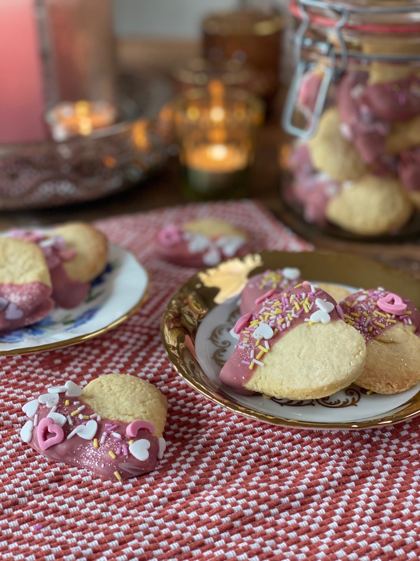 Bak koekjes in hartjes vorm met ruby roze chocolade en versier de koekjes met hartjes sprinkles. Geef de koekjes bijvoorbeeld cadeau in een weckpot met een leuk Valentijnskaartje erbij.