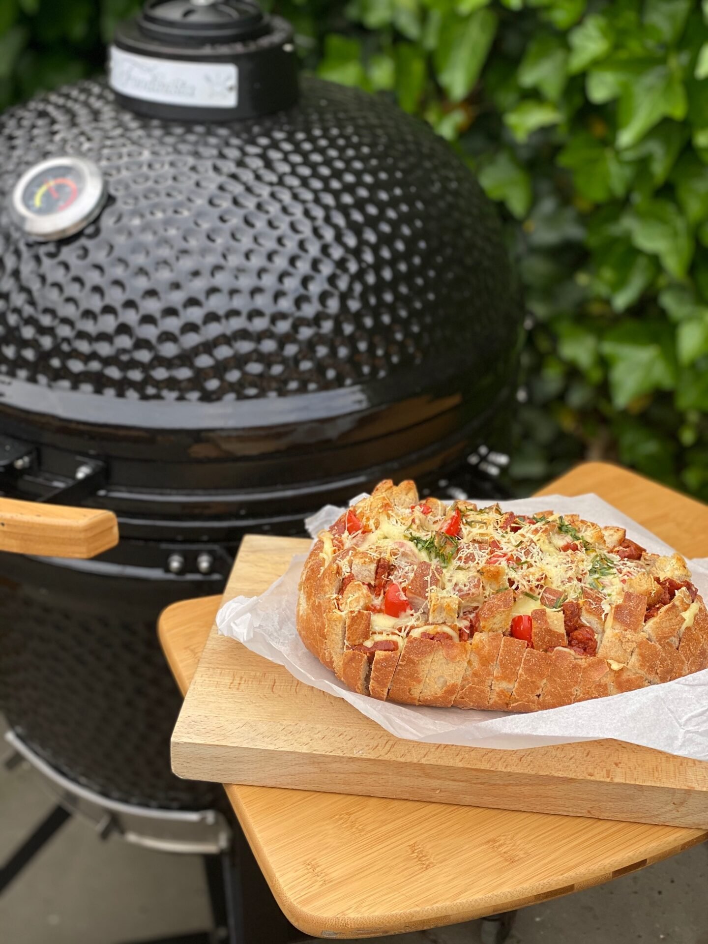 Vouw de folie naar boven toe dicht en dek het borrelbrood aan de bovenkant nog een keer af met een nieuw stuk folie. Plaats het borrelbrood voor 3 minuten op het rooster bij de directe verhitting, zodat het een geroosterde smaak krijgt en vervolgens voor 15 minuten op de indirecte verhitting, op het hoge rooster. De barbecue mag dicht, zodat het goed warm blijft in de barbecue. Haal na een kwartier het borrelboord van de barbecue af. Plaats het borrelbrood op een mooie borrelplank. Vouw het folie open en haal het zo goed mogelijk weg. Strooi over het borrelbrood nog extra verse kruiden en smullen maar!